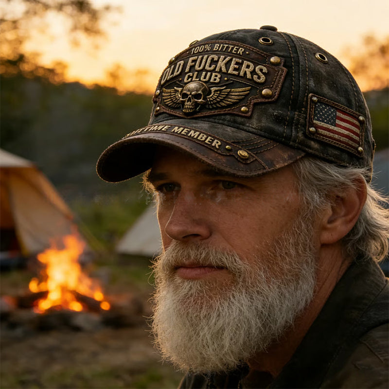 BRODERIE VINTAGE ÎNDRĂZNEATĂ – Afișează-ți experiența cu emblemele care poartă inscripțiile „OLD FUCKERS CLUB”, „100% BITTER” și „LIFETIME MEMBER”. Această șapcă este o insignă de onoare, sărbătorind o viață bine trăită cu un stil neiertător și robust.