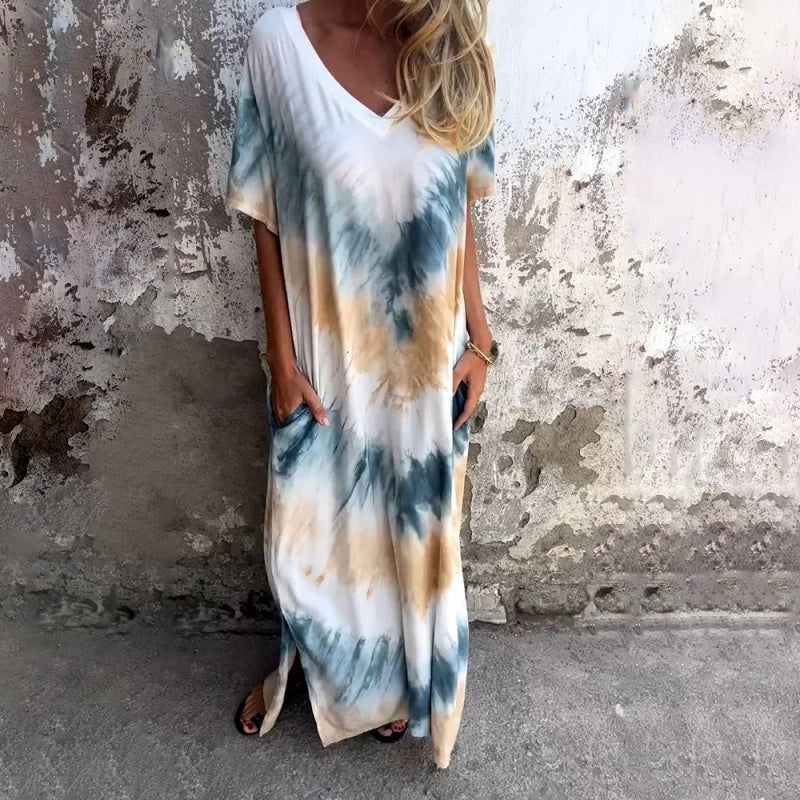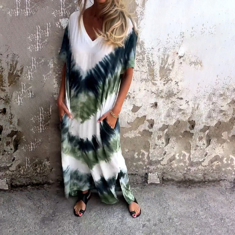 Pășiți în vară cu stil și confort în rochia noastră lungă lejeră cu imprimeu în V. Fabricată din țesătură ușoară și respirabilă, această rochie este concepută pentru a vă menține răcoroasă și relaxată în timpul lunilor fierbinți de vară. Ținuta lejeră și relaxată oferă libertate de mișcare și o siluetă măgulitoare pentru toate tipurile de corp.