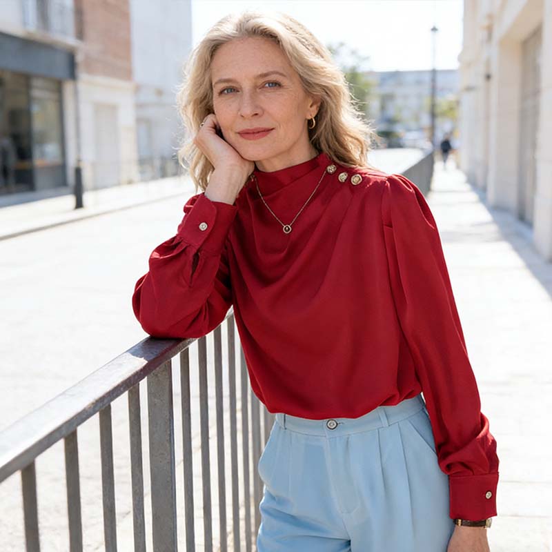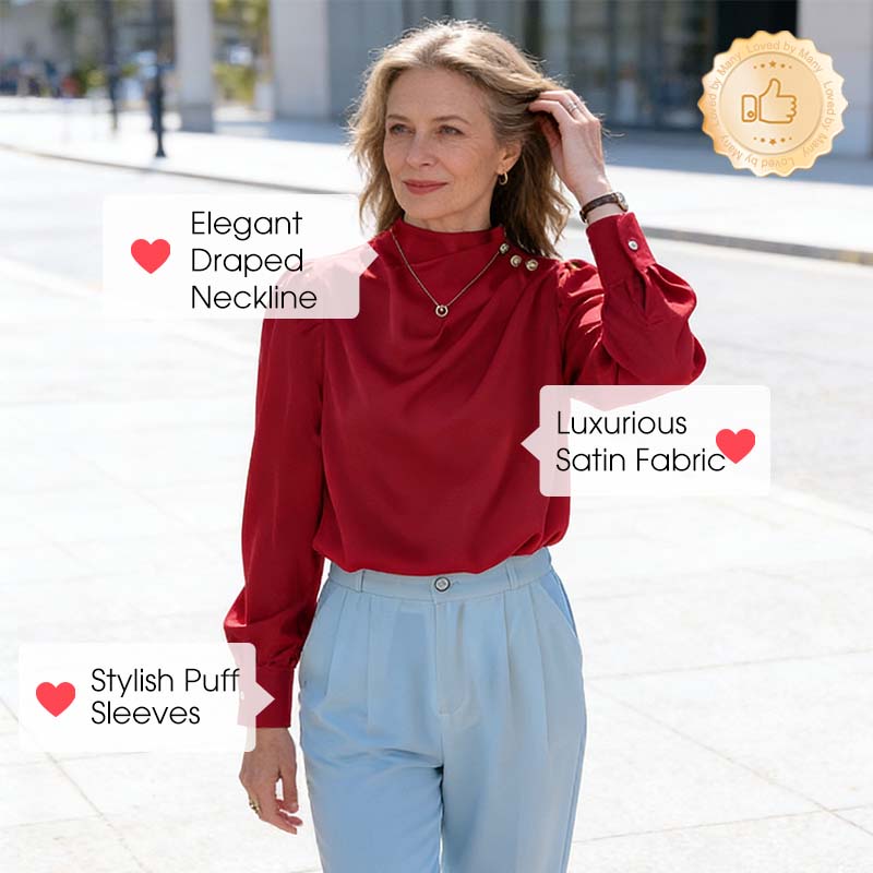 Bluză elegantă cu guler drapat, asemănătoare satinului