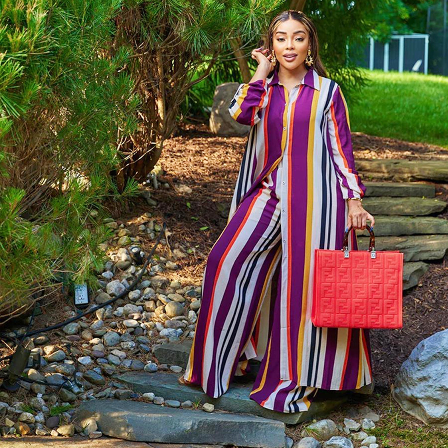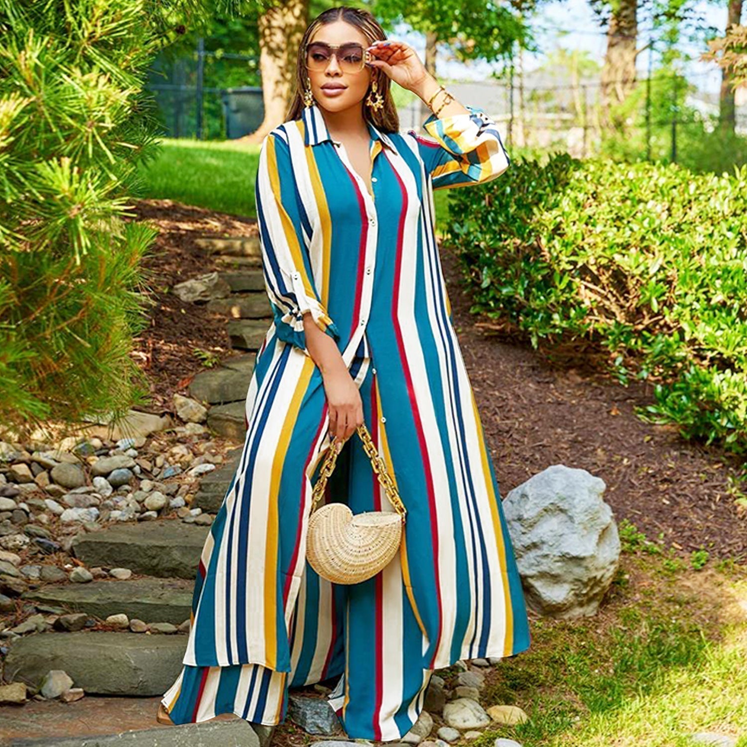 Acest set de salopetă cu mâneci lungi în dungi pentru femei, cu pantaloni asortați cu mâneci lungi, este confecționat dintr-un material mixt de calitate superioară. Este foarte elastic, durabil și confortabil, ceea ce îl face un articol esențial pentru toate anotimpurile. Seturile de pantaloni din două piese en gros pot rezolva dilemele tale vestimentare.