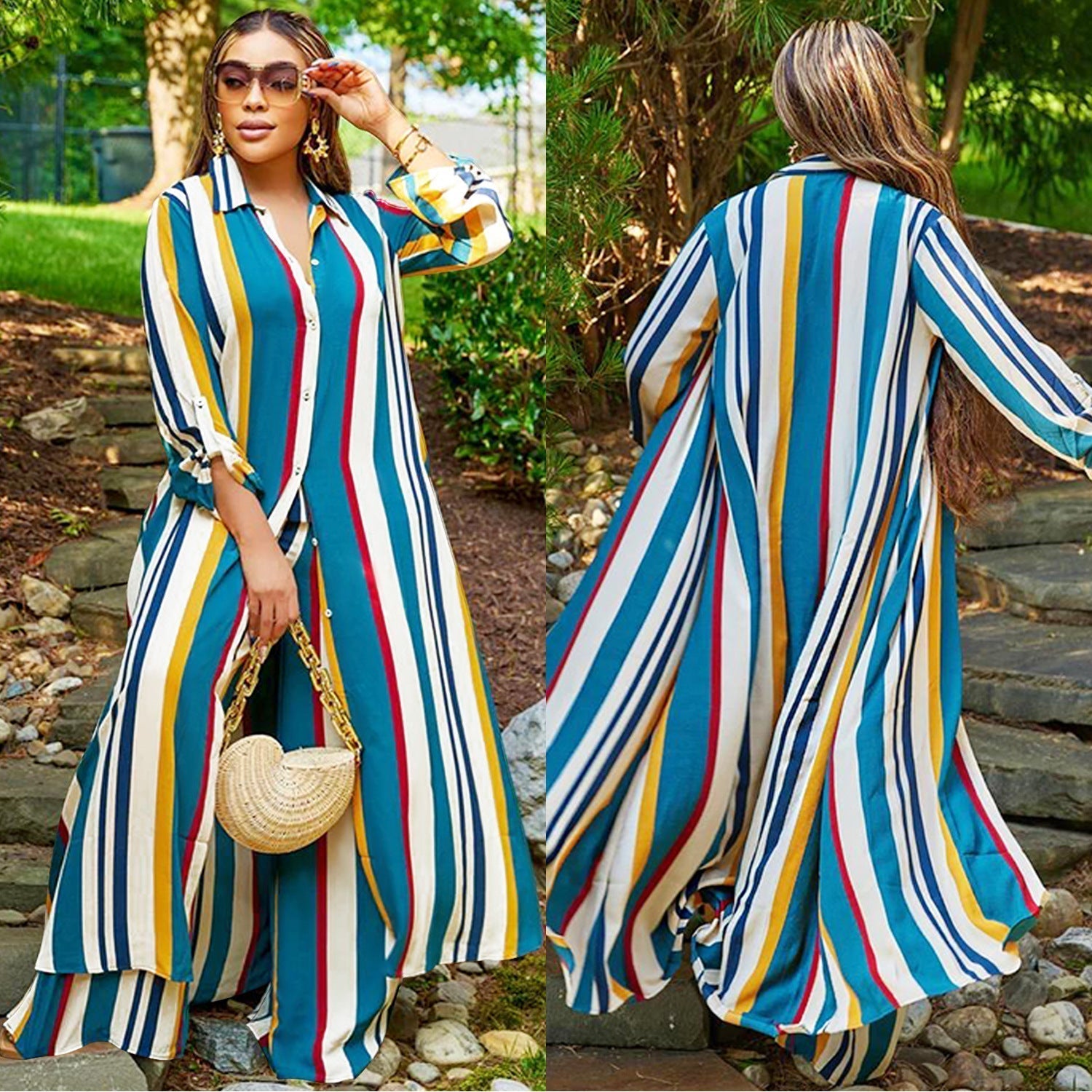 Set din două piese pentru femei: salopetă cu mâneci lungi în dungi + pantaloni