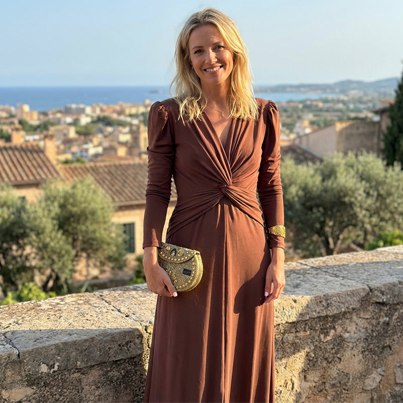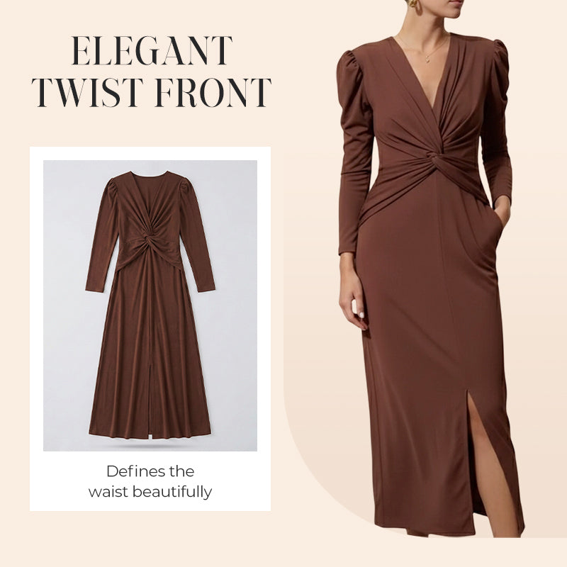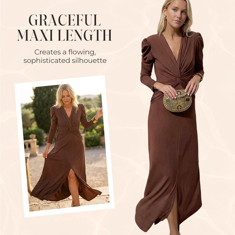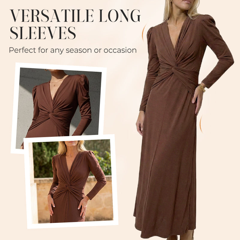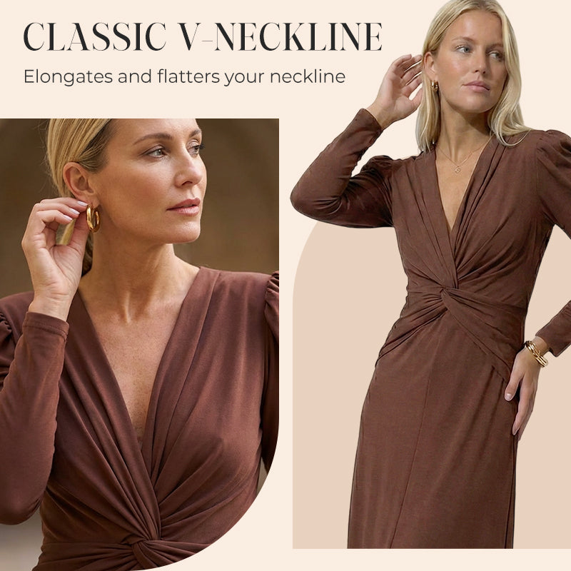 MÂNECI LUNGI - Oferind o acoperire elegantă și un plus de căldură, mânecile lungi fac din această rochie o alegere versatilă pentru sezonul de tranziție și evenimentele de seară, echilibrând decolteul în V cu un finisaj rafinat și elegant.